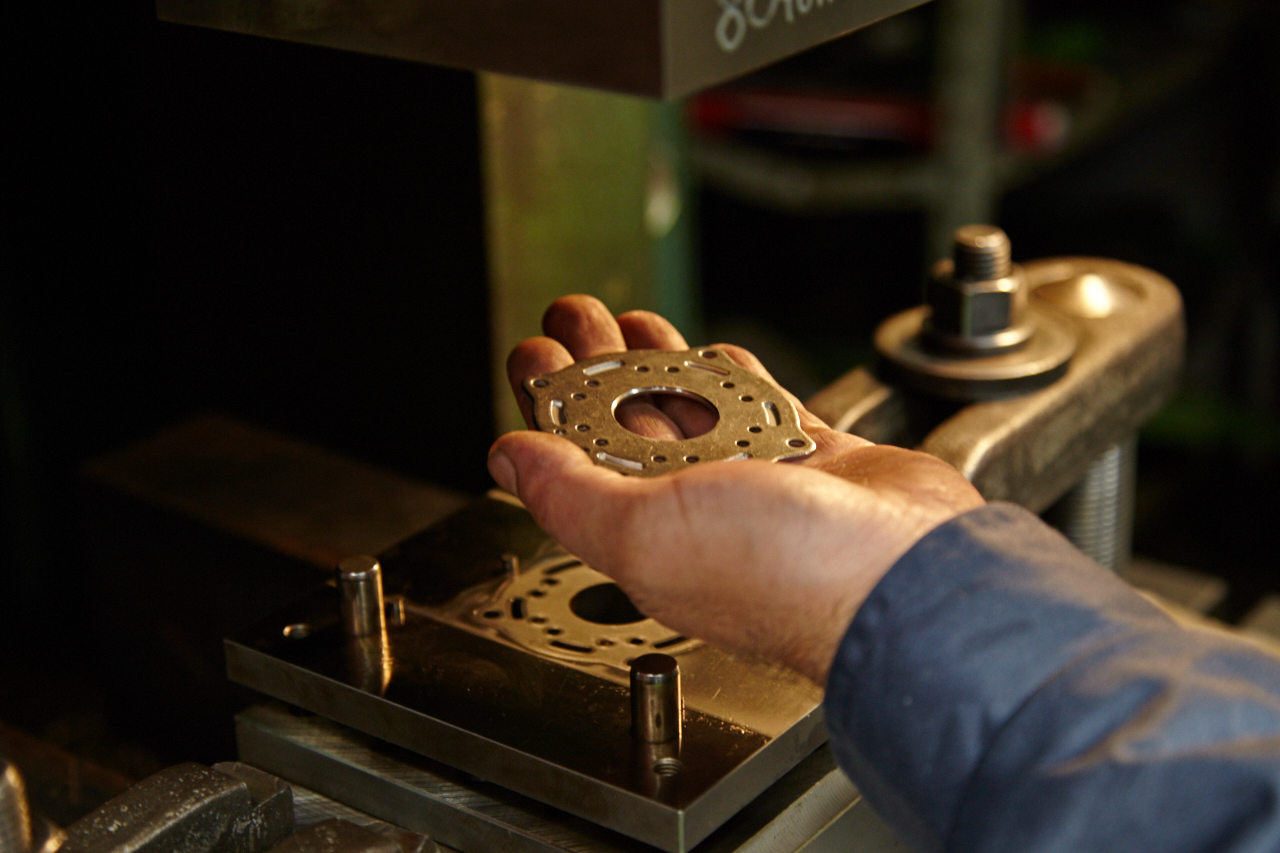 プレス機の回転数の設定、ストロークの高さ、ダイクッションの力の加減で曲がったり素材の伸び率が大きく異なりますので、完成品は職人の技術、知識と経験によって左右されます。